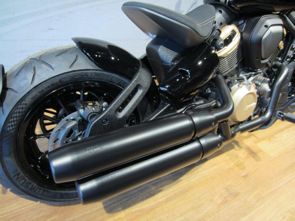 This model presents an imposing stance with fat, wide tyres on chunky alloy rims, hidden rear suspension for that authentic Hard Tail look, short 'Bobbed' fenders and stacked twin shotgun silencers