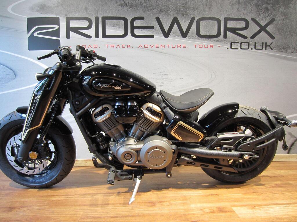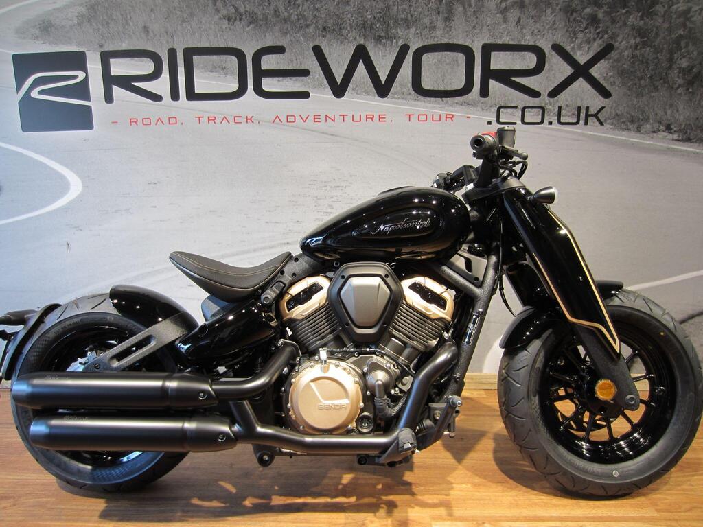 The Napoleon 500 V-Twin Bobber stands out with a short floating solo seat, scabbard-style shrouded forks and the exclusive "Flying Wing" handlebar that invites you to adopt a thoroughly sporty riding posture