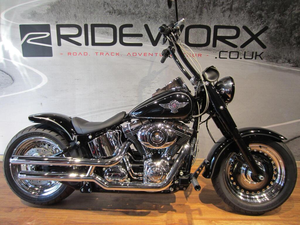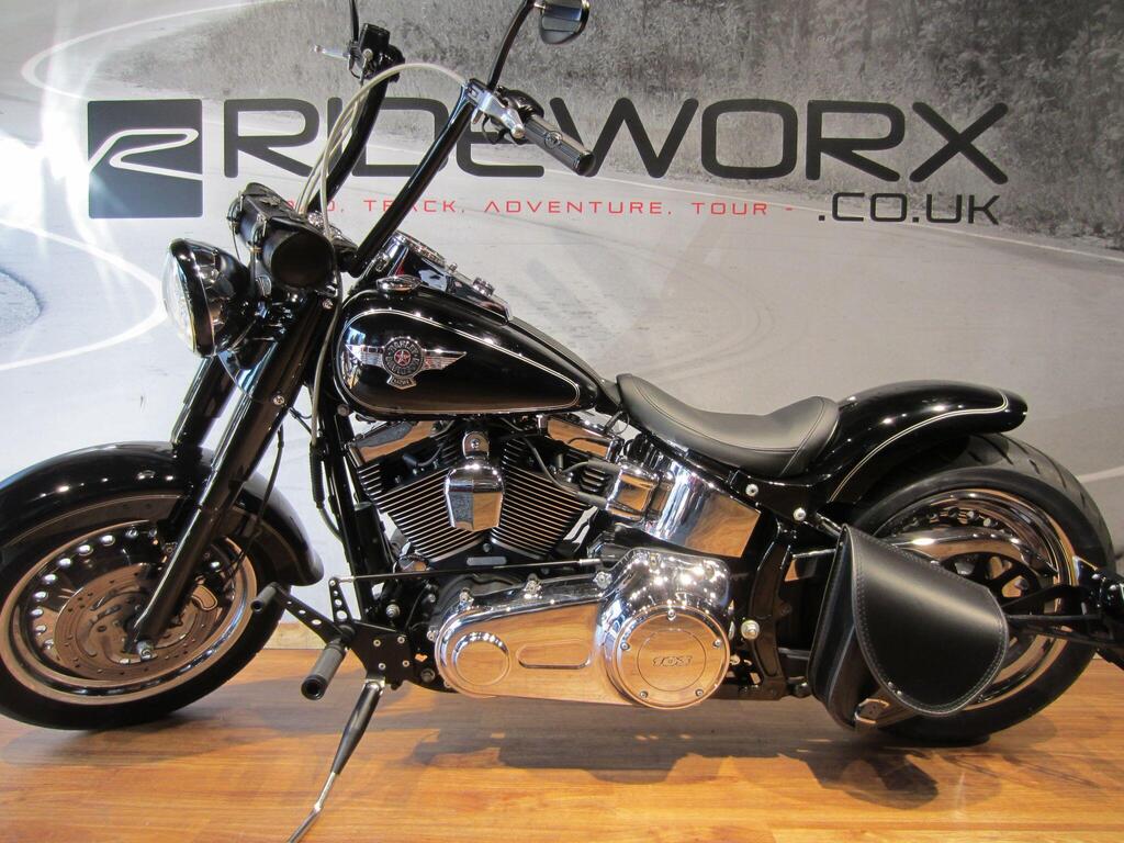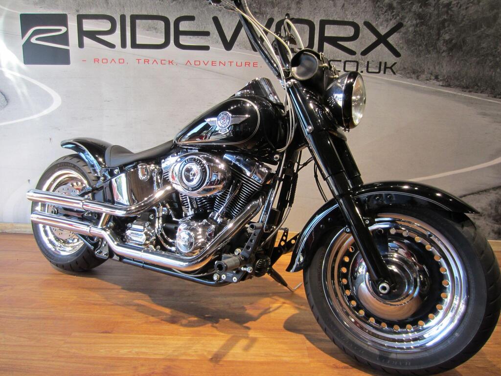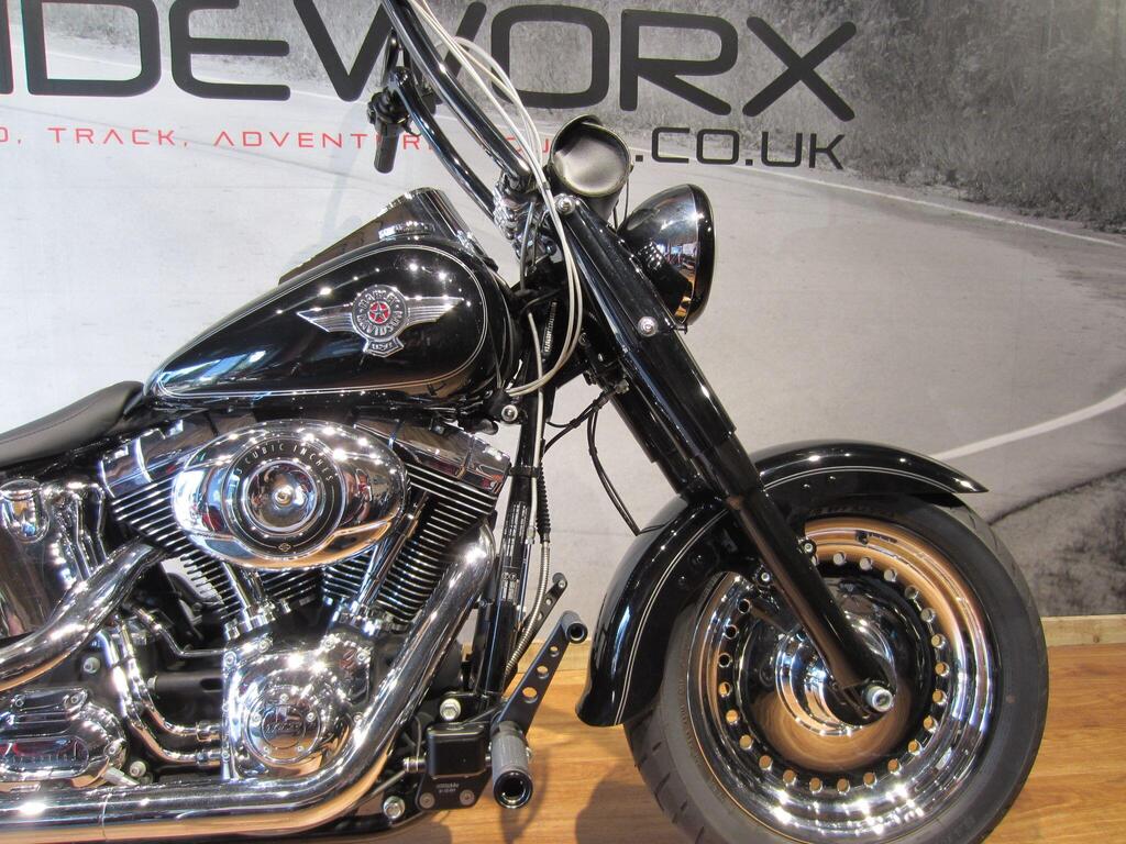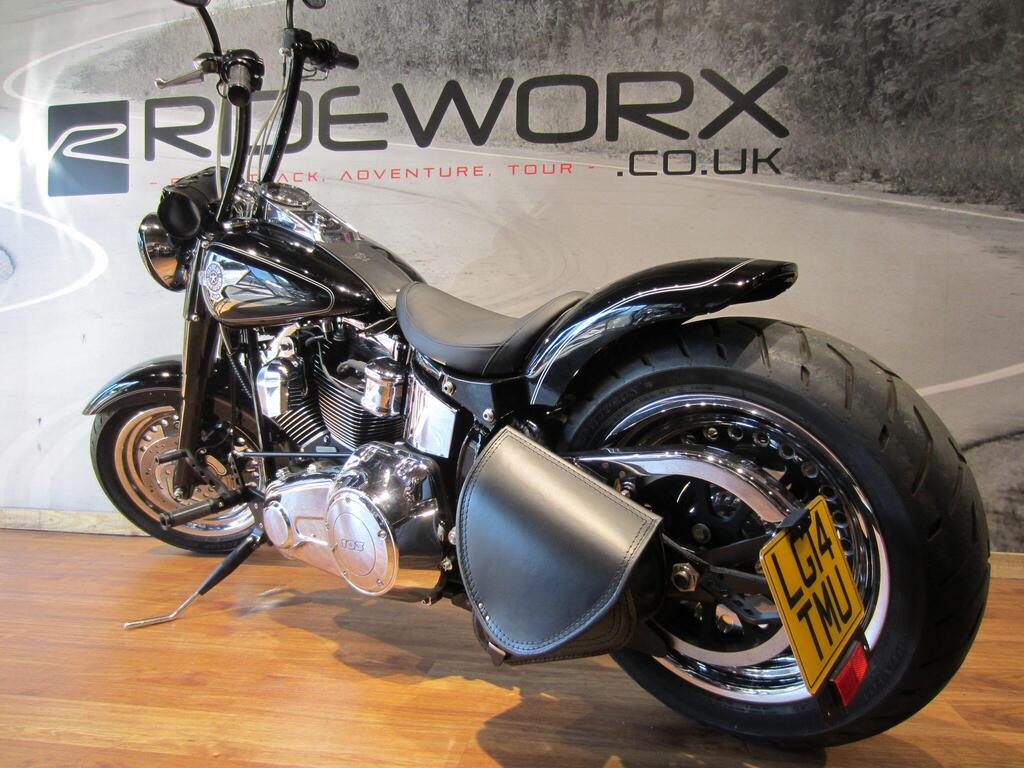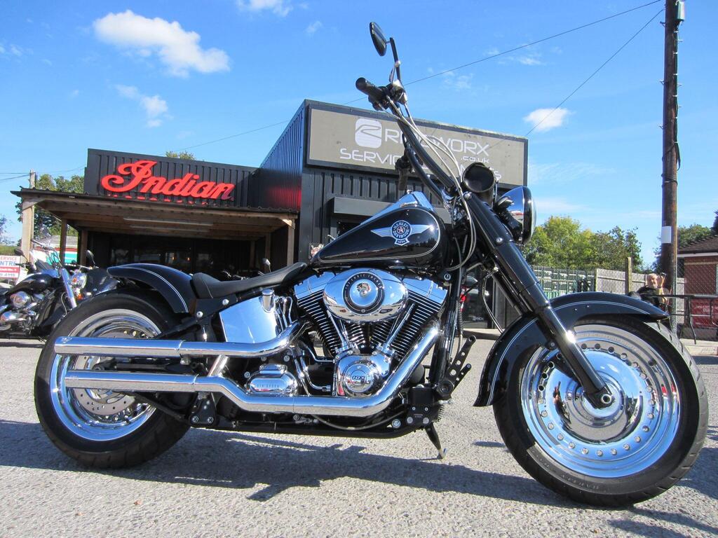 Super condition Harley Davidson Fat Boy Custom! 11000 miles with a full history and very tastefully customized! Great chrome work all round and front to back mods include - Tool/ roll bag above the headlight - Ape hanger bars that although they look high are surprisingly comfortable and really give the bike serious curb appeal! down the bike you will see a host of nice add-ons, forward controls fitted with foot pegs, toe pegs and then there's the stage 1 filter and V&H pipes that every Harley owner looks for! A solo seat and side bag finish off the mid section before getting to the custom rear end with integrated stop/tail and indicators, finished off with a nice side mount plate! all wrapped up lovely iconic black paint with tidy white pin stripe to highlight the bikes shape. Lovely bike that has been thoughtfully put together and customized to turn heads but at the same time still a pleasure a ride and cruise on! IN STOCK NOW! HPI checked and clear, PX welcome, FINANCE OPTIONS AVAILABLE. Please call us on 01189 780089 to discuss further.
