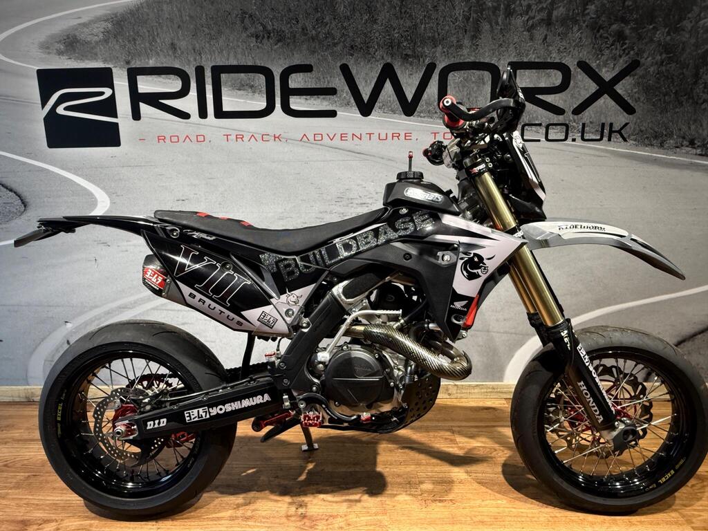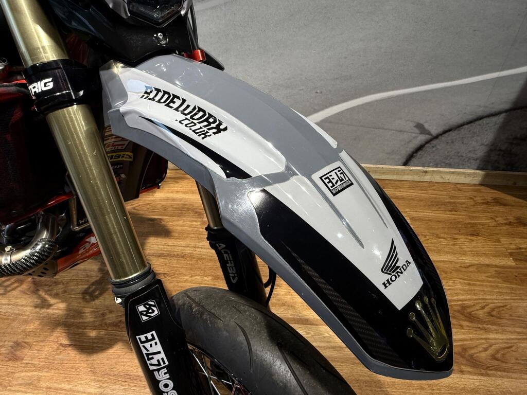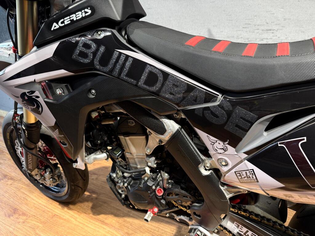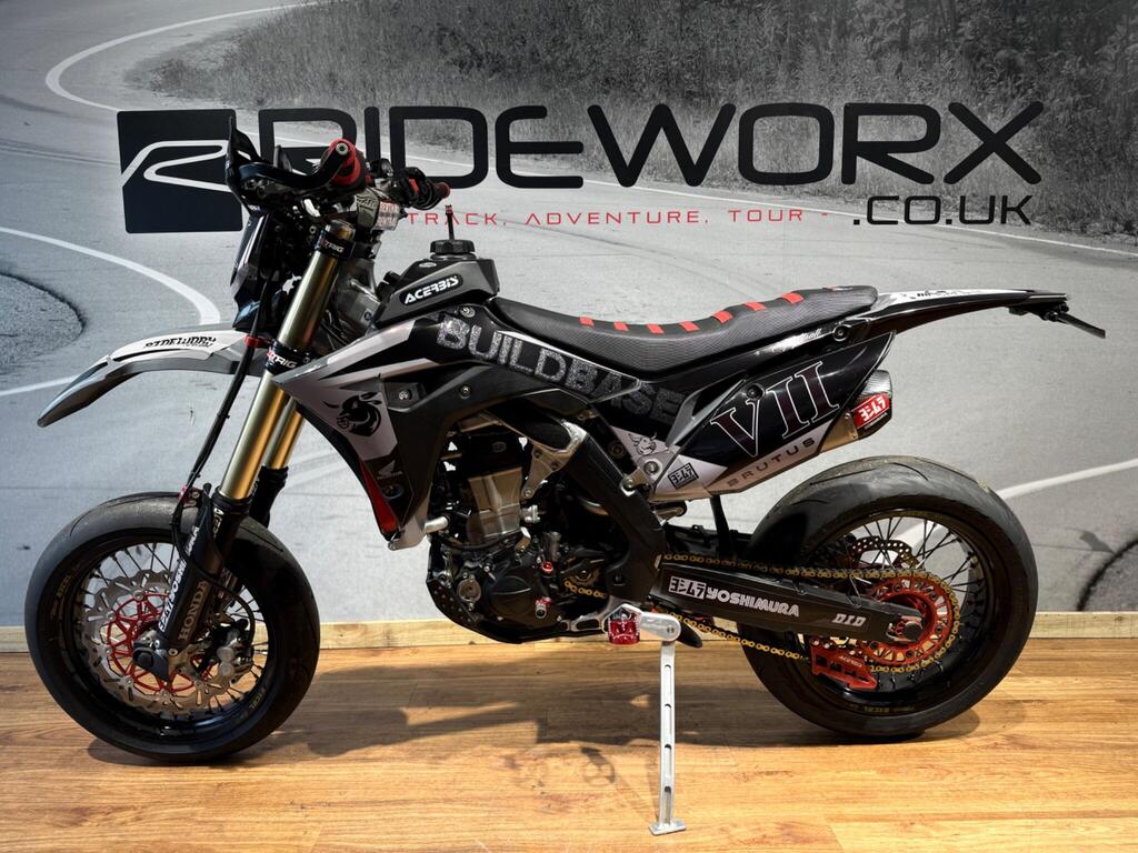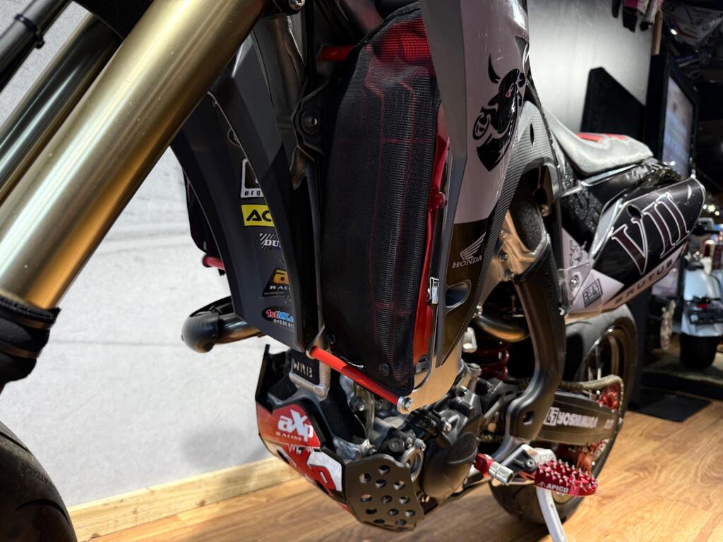 Honda CRF 450 has always been a handful, and this bike is no exception! Custom built from full CRF 450R race bike into this road legal, road registered, Street machine! a real head turner and properly converted. with only 105 miles or 35 hrs from new, the bike boasts custom graphics, full Yoshi twin exit exhaust system, hand guards, lighting kit, digital speed, talon hubs and excel rims, big brake conversion. Not for the faint hearted and no test rides will be allowed (before you ask if you an have a go...) available to view with prior appointment - THIS BIKE IS NOT KEPT ON SITE - PLEASE CALL AND ARRANGE A VIEWING