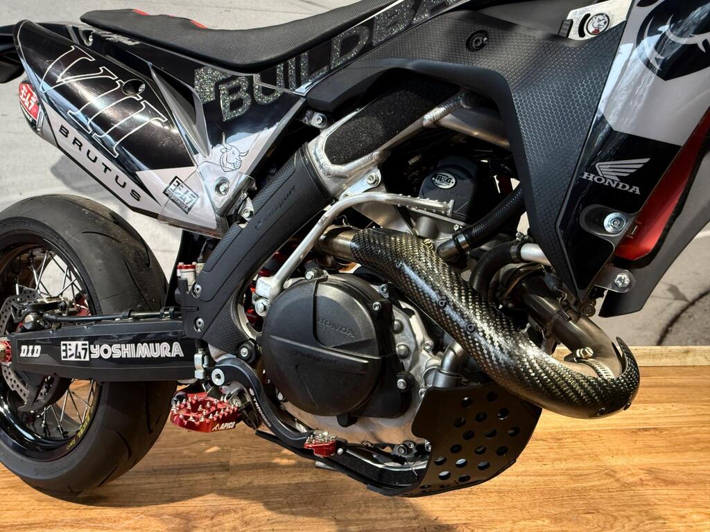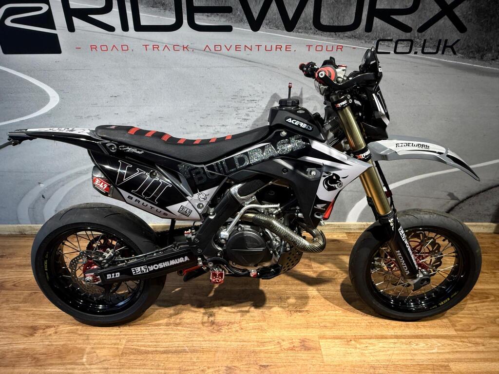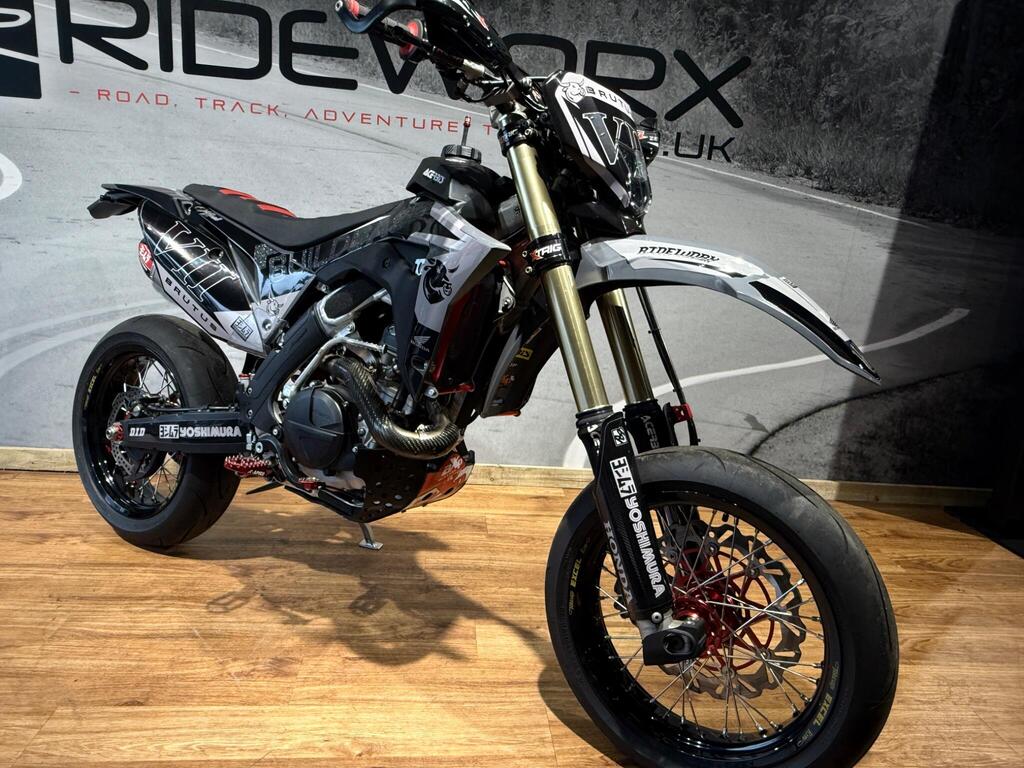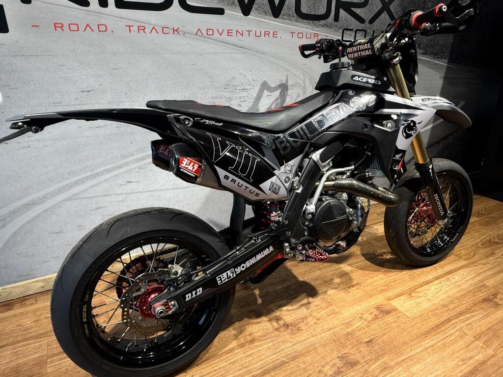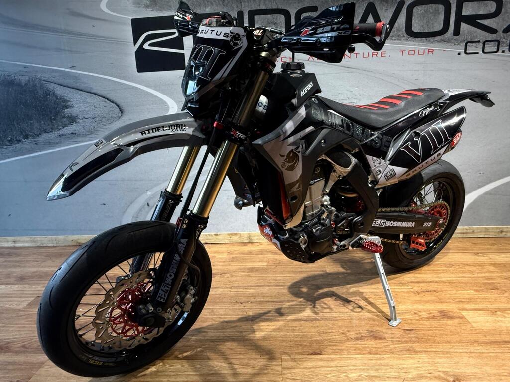 Honda CRF 450 has always been a handful, and this bike is no exception! Custom built from full CRF 450R race bike into this road legal, road registered, Street machine! a real head turner and properly converted. with only 105 miles or 35 hrs from new, the bike boasts custom graphics, full Yoshi twin exit exhaust system, hand guards, lighting kit, digital speed, talon hubs and excel rims, big brake conversion. Not for the faint hearted and no test rides will be allowed (before you ask if you an have a go...) available to view with prior appointment - THIS BIKE IS NOT KEPT ON SITE - PLEASE CALL AND ARRANGE A VIEWING