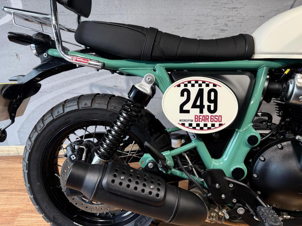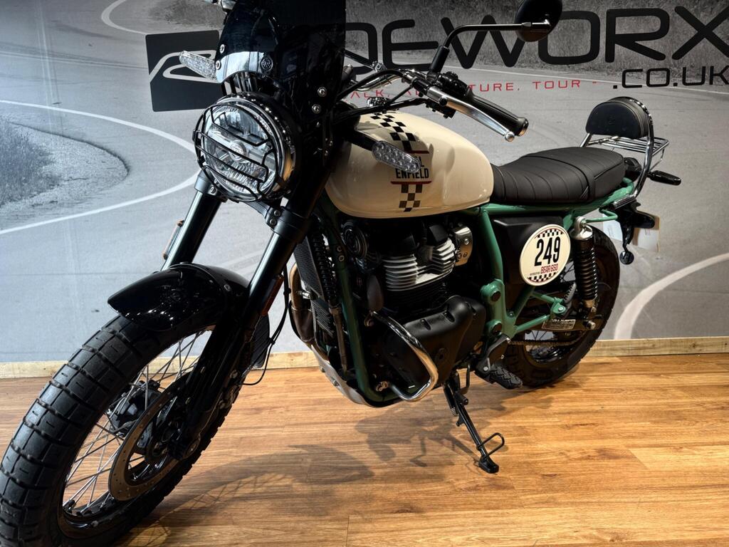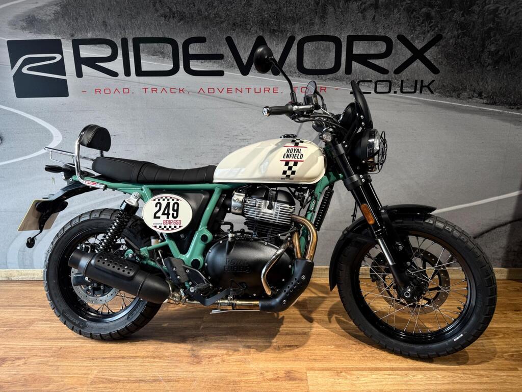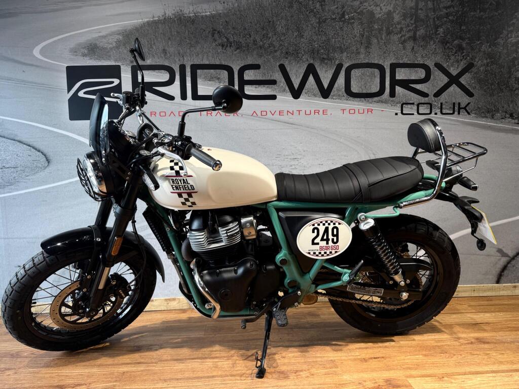Absolutely stunning Royal Enfield BEAR 650! with only 580 Miles!! 1 owner! Immaculate condition with Pillion back rest, fly screen, headlight grill. A true classic scrambler inspired bike with modern tech and safety features. The green frame and race inspired tank and graphics really set the bike apart from other models. Great Value bike, in stock and ready to go!