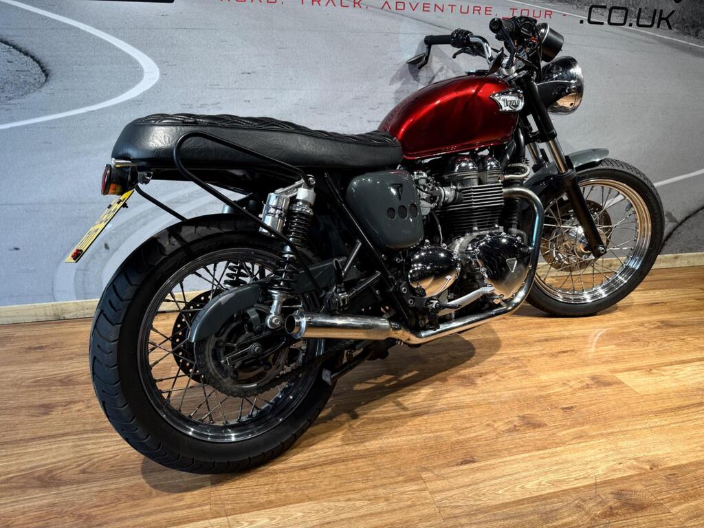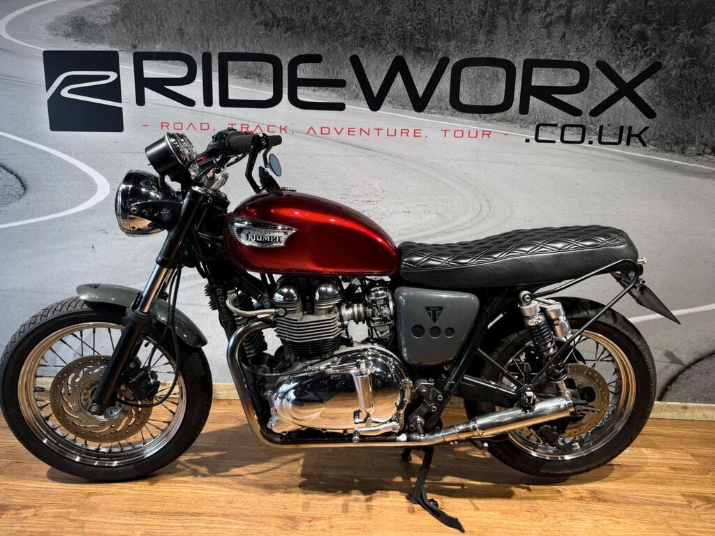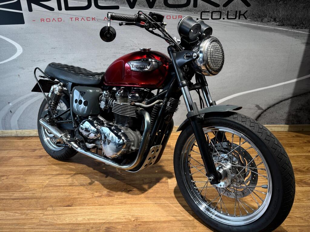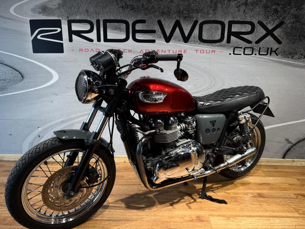 Nice Bright modded Bonnyville 865 T100. Painted in great metallic red, with polished engine cases, custom seat, LED light and tiny LED indicators, rear side rack to take throw over bags, and great sounding twin exit pipes. lovely condition with 34500 miles and lots of service bills and history. A great little bike for the summer that will turn heads and be pleasure to take on those sunny morning blasts!